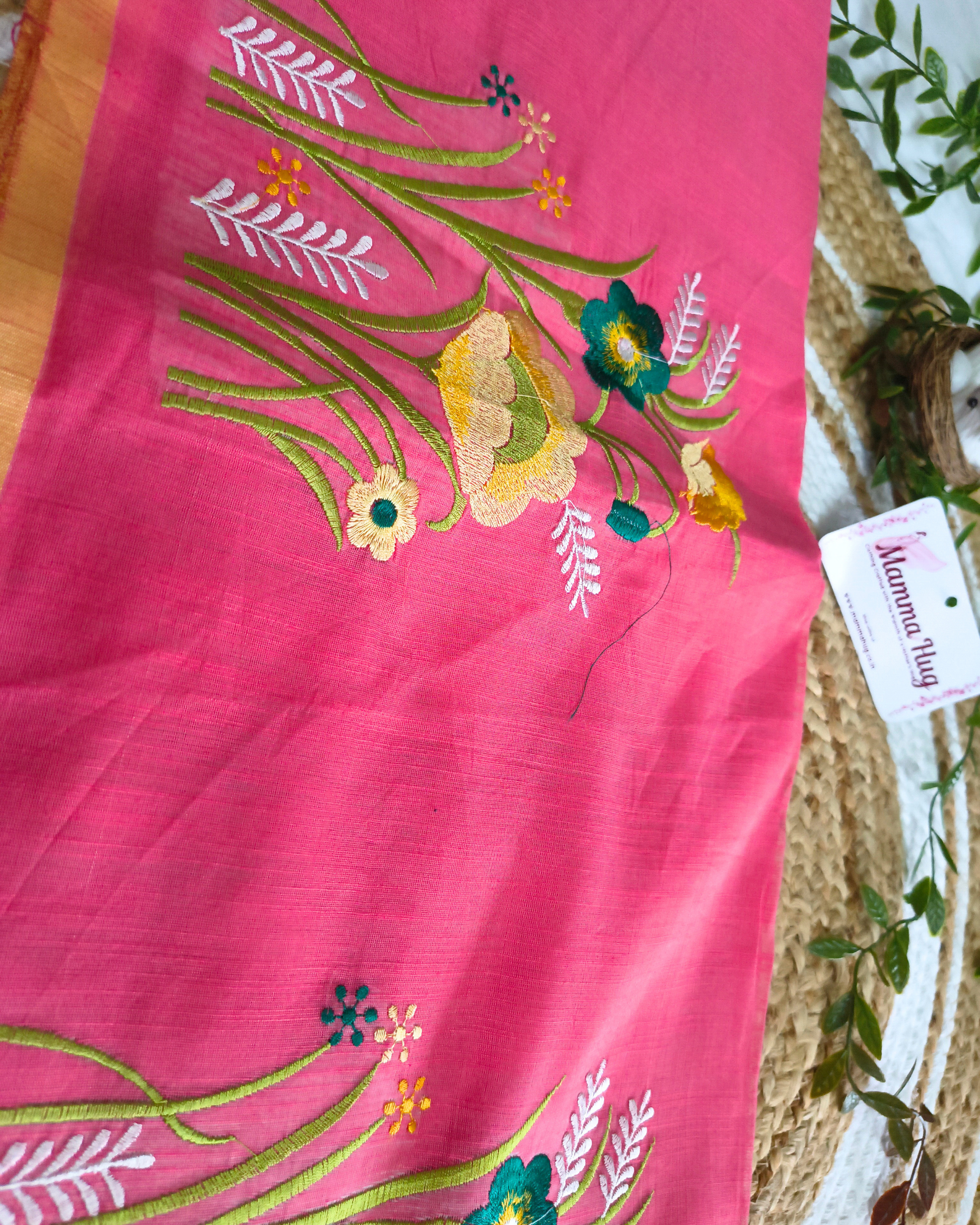 Floral Embroidery Handloom Saree - Slub Cotton (Peach Rose)