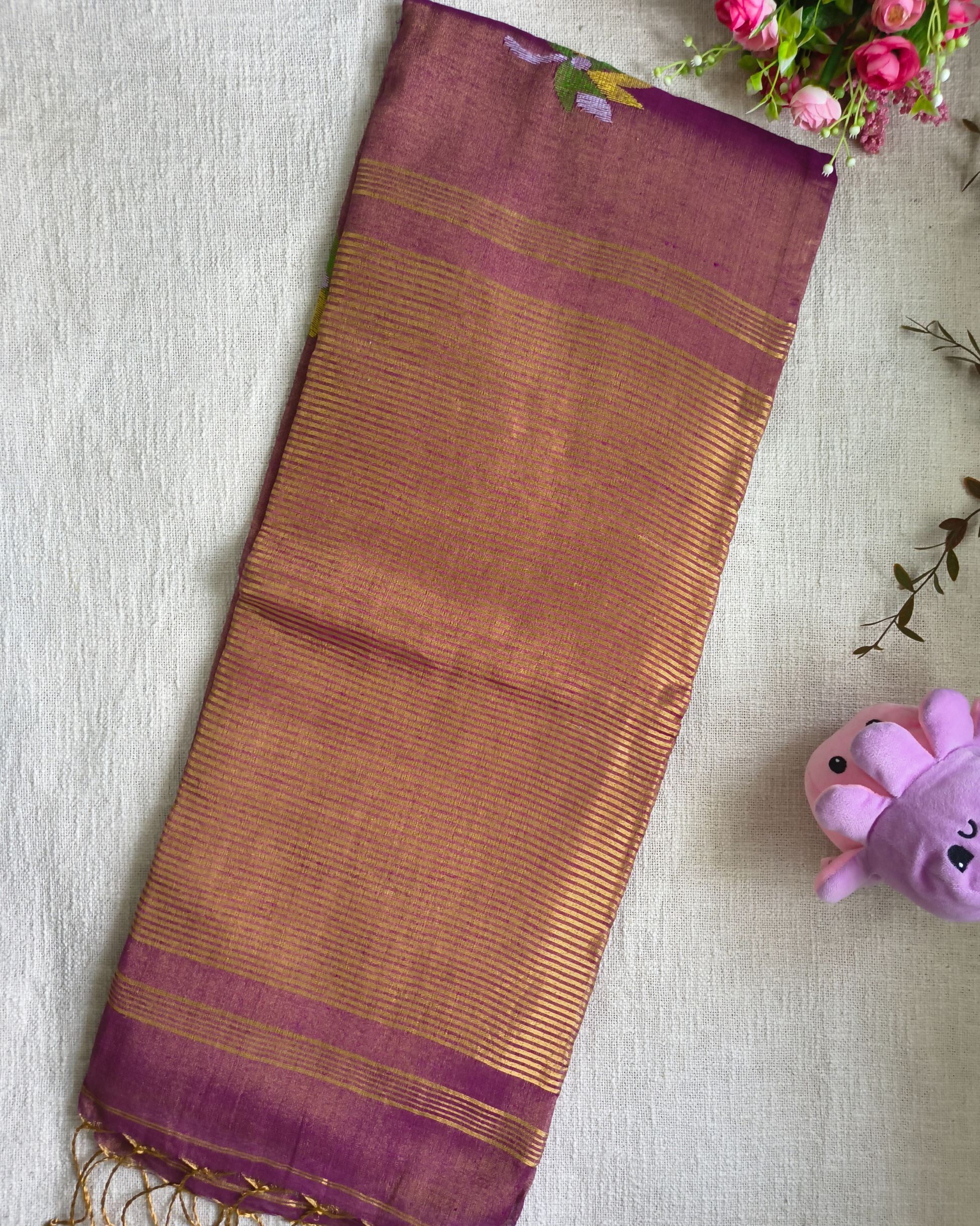 Handloom Tussar Tissue with golden border, Jamdhani woven to perfection for comfort and grace. The breathable linen blend keeps it airy and lightweight, while the delicate tissue weave adds a natural sheen that makes it perfect for festivals, weddings, and special occasions.