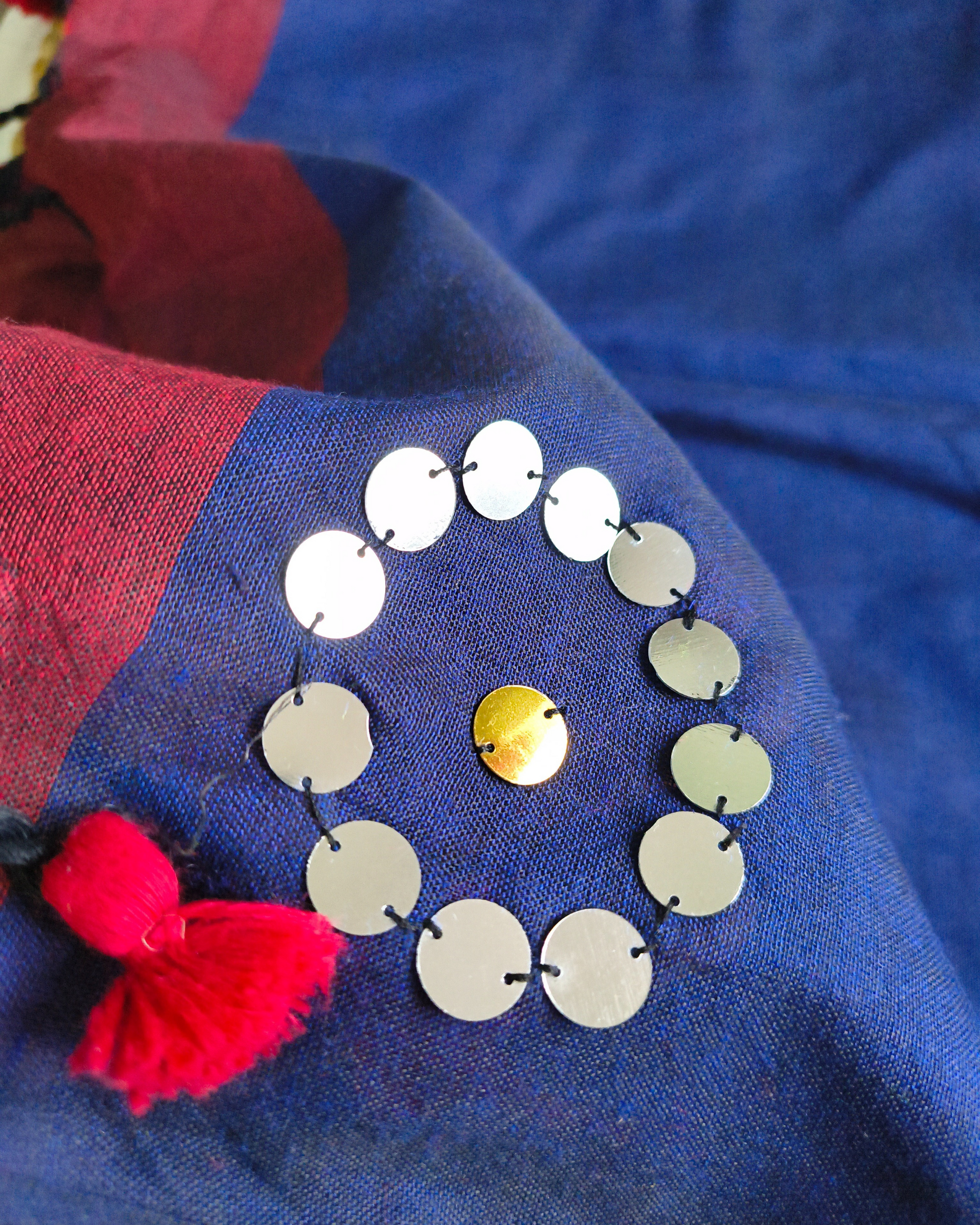 Khadi Cotton Handloom Saree with Mirror design - Dark Blue & Crimson