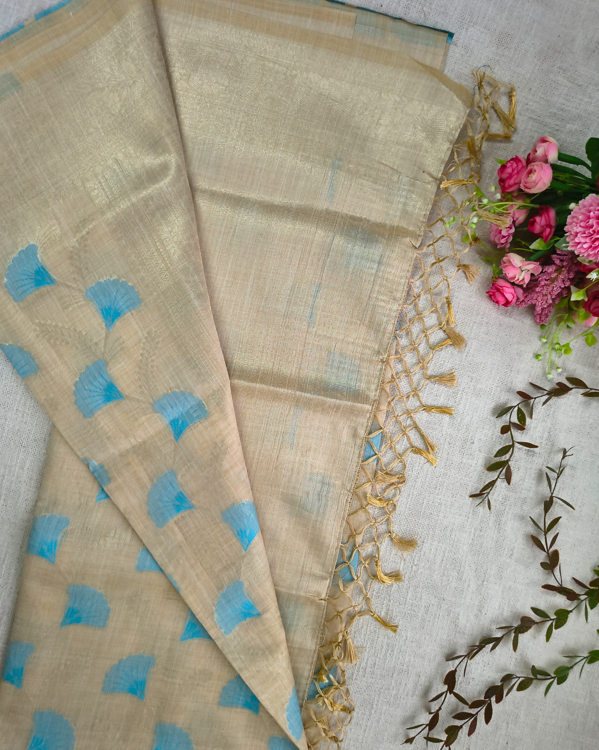 Semi Silk Saree with floral deisgn - Beige & Blue