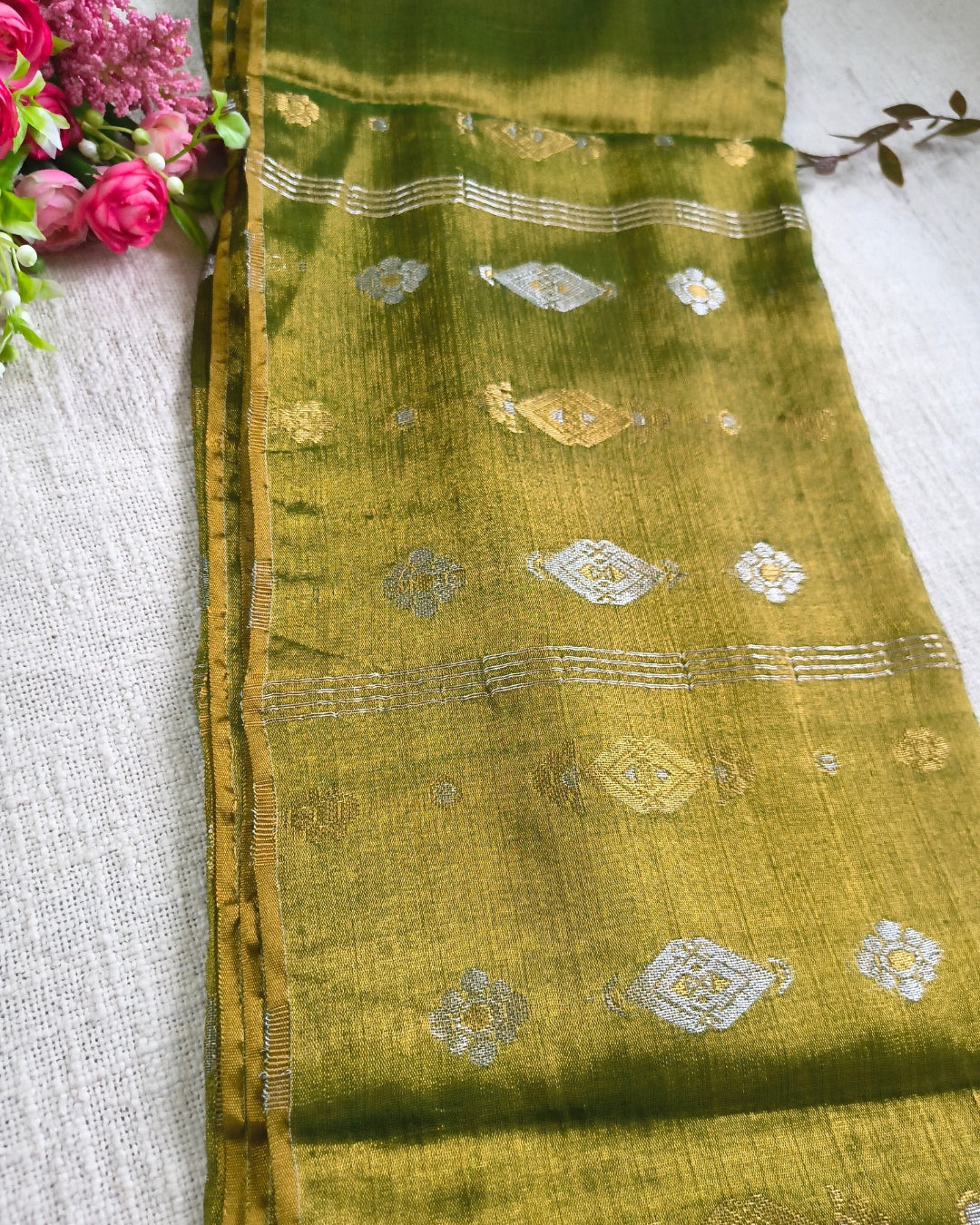 Soft Linen Tissue Saree with Golden Silver Zari weaving - Golden Olive
